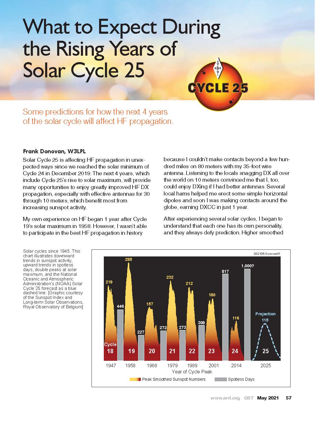 The winning article for the May 2021 QST Cover Plaque award is “What to Expect During the Rising Years of Solar Cycle 25, by Frank Donovan, W3LPL.