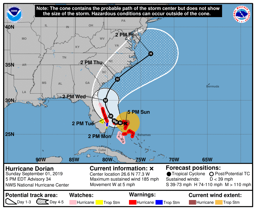 According to the National Hurricane Center, as of 2100 UTC on September 1, Dorian was some 95 miles east of Freeport, Grand Bahama Island, and about 175 miles east of West Palm Beach, Florida, packing maximum sustained winds of 185 MPH. The storm has continued its slow movement to the west at 5 MPH.