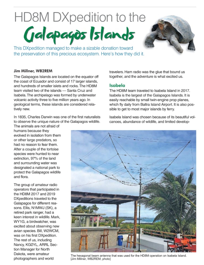 The winning article for the April 2020 QST Cover Plaque award is “HD8M DXpedition to the Galapagos Islands” by Jim Millner, WB2REM.